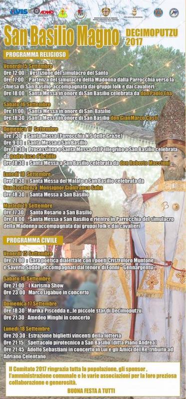 Sono iniziati i festeggiamenti in onore di San Basilio Magno a Decimoputzu, dove un ricco calendario di appuntamenti attende cittadini, turisti e visitatori che si troveranno a passare qui fino a martedì 19 settembre 2017.